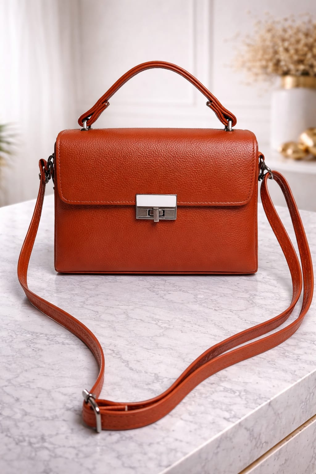 Add a bold touch of sophistication to your wardrobe with the Terracotta Luxe Lock Satchel, a statement handbag designed for modern elegance. Featuring a rich burnt-orange (terracotta) tone and a refined textured finish, this bag instantly enhances any outfit with warmth and style.